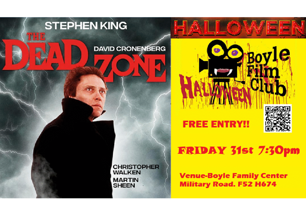 31 Oct 2025 – Free Halloween Special The Dead Zone (1983) Trailer Venue: Boyle Family Resource Center, 7:30 PM Free entry. No booking required. Just turn up at door. https://www.imdb.com/title/tt0085407